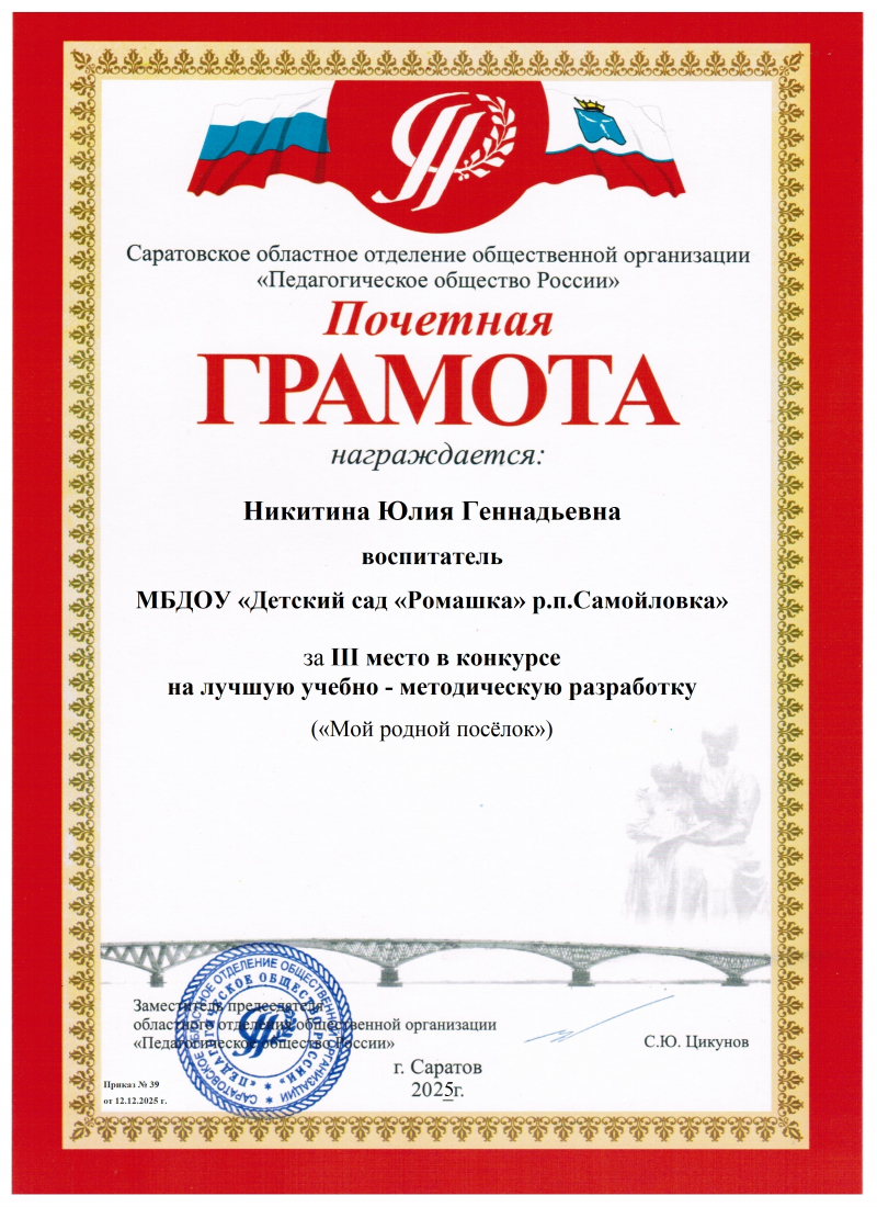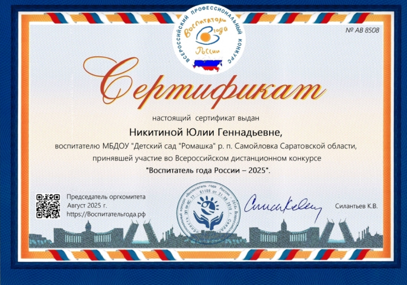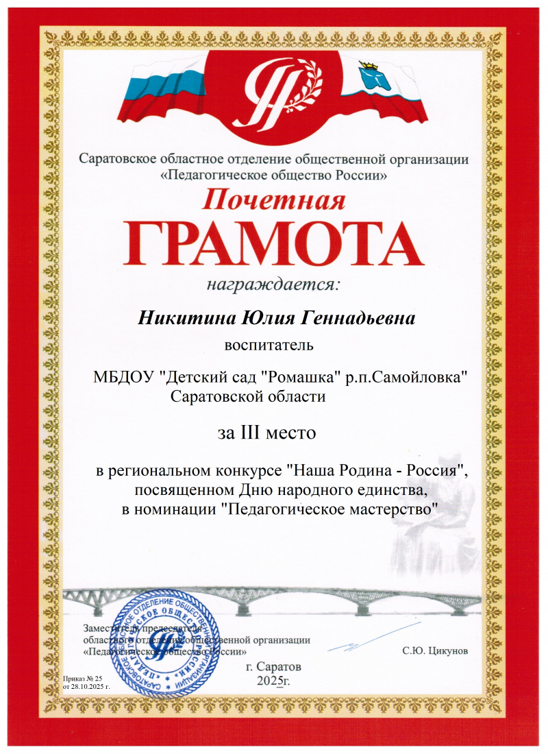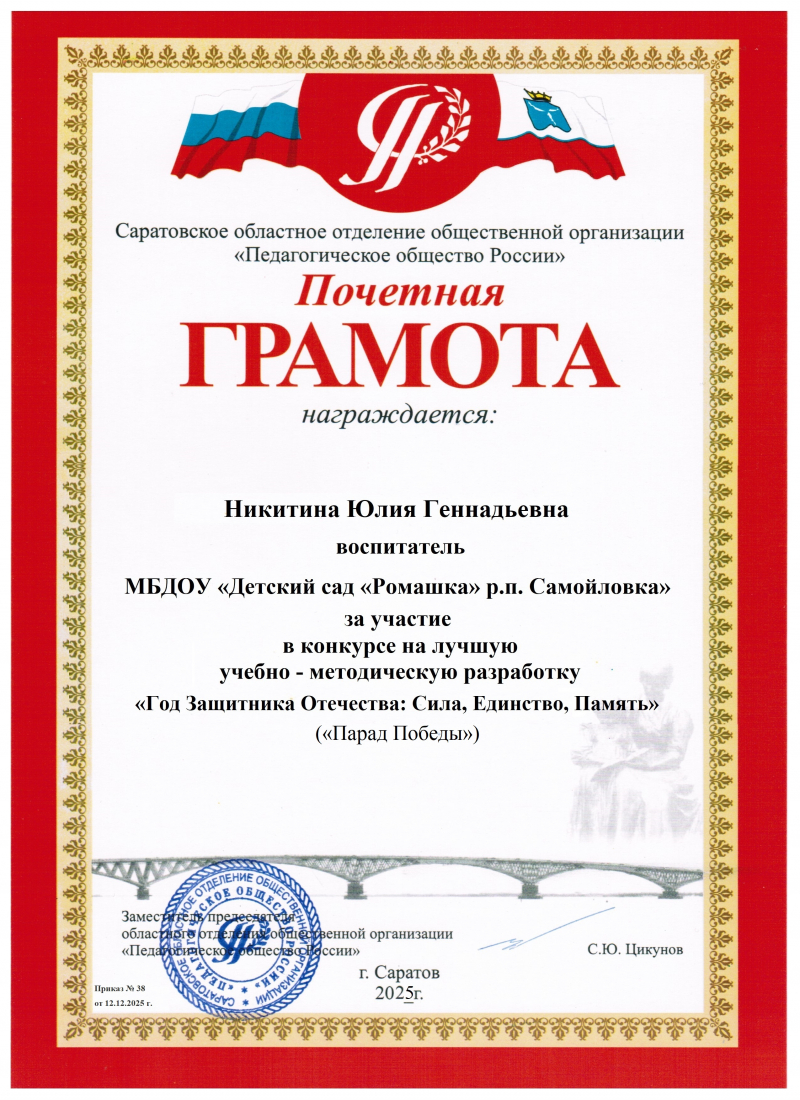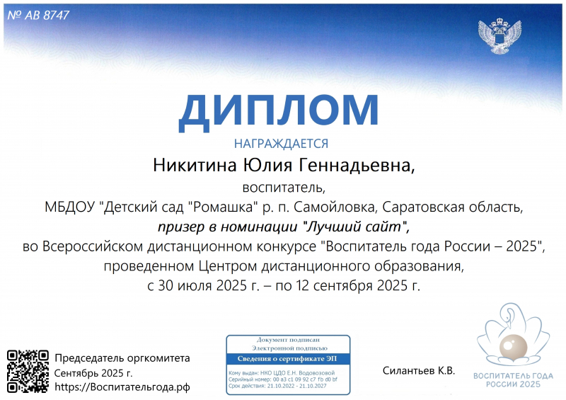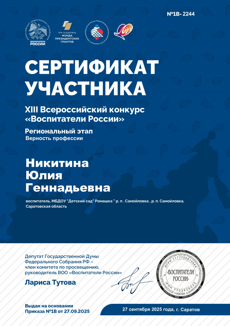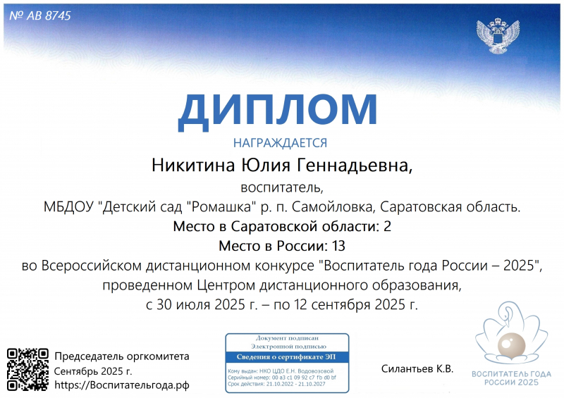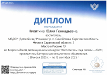 Никитина Юлия Геннадьевна - воспитатель высшей квалификационной категории, педагог - наставник, почетный работник общего образования РФ.