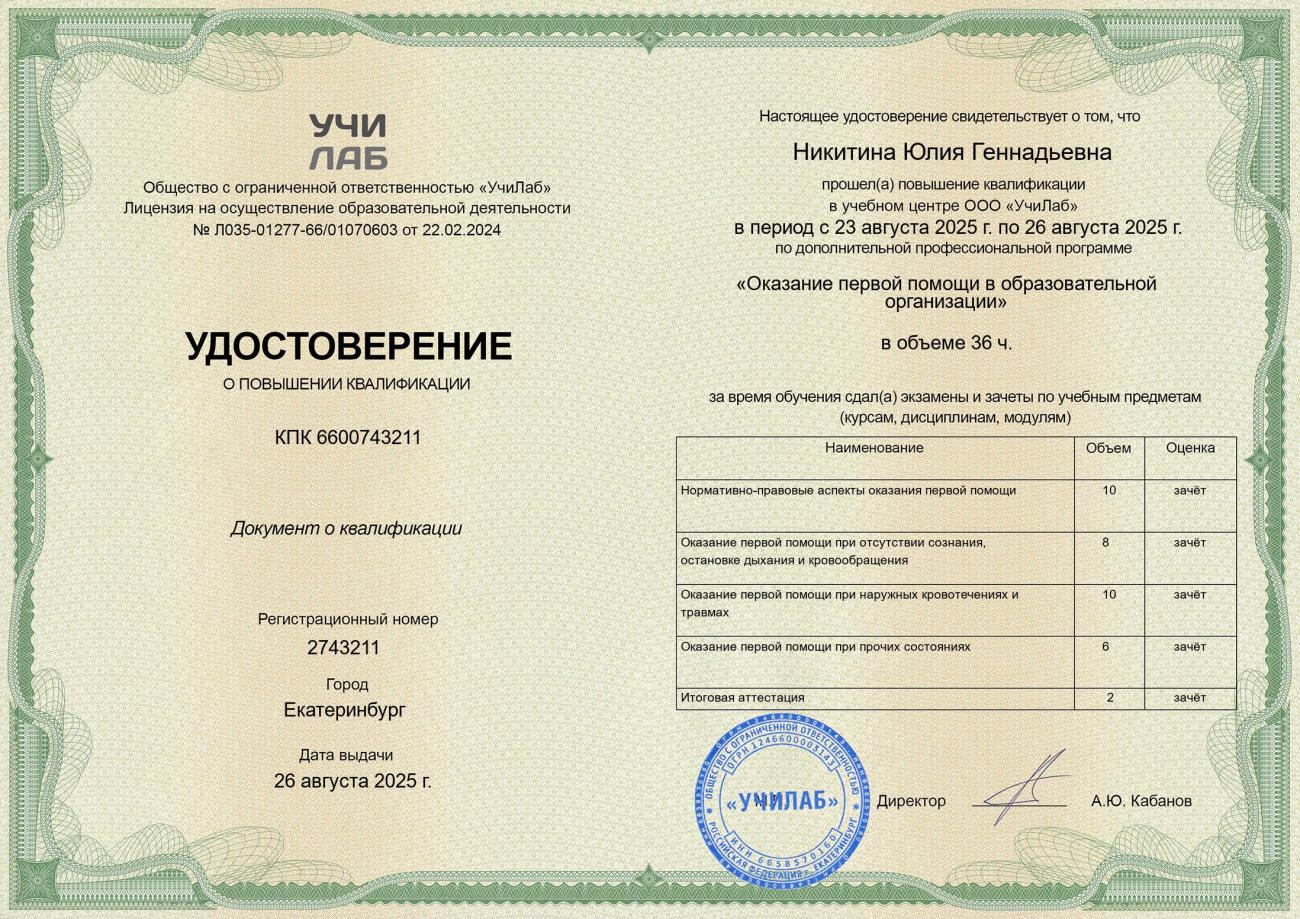 Никитина Юлия Геннадьевна - воспитатель высшей квалификационной категории, педагог - наставник, почетный работник общего образования РФ.